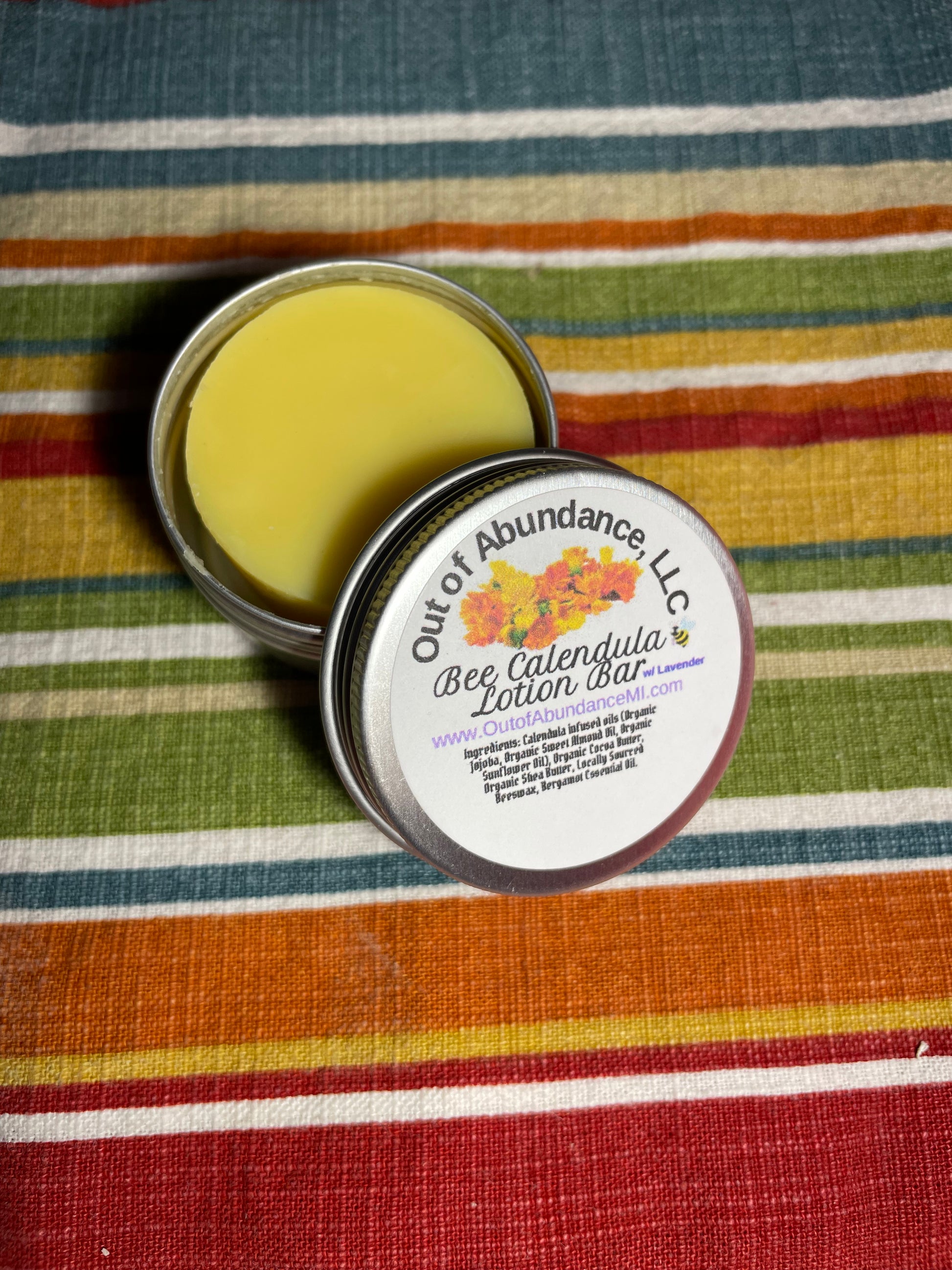 Out of Abundance Bee Calendula Lotion Bars are a super moisturizing waterless lotion concentrate. Our solid bars are packed full of quick absorbing oils/butters to moisturize and beeswax to seal the moisture in. The sealing effect of the beeswax prevents trans-dermal water loss for a long lasting effect. Bee Calendula Lotion bars are a natural choice made with organic oils and butters including; jojoba oil, sweet almond oil, sunflower oil, cocoa butter and shea butter. The calendula infused oils give these bars the wonderful herbal properties including healing, anti-microbial, anti-fungal and anti-inflammatory. The essential oil fragrances in Out of Abundance Lotion Bars are free of phthalates and parabens making them a clean beauty product. Choosing a waterless lotion bar saves resources. By using ONE (full size) Solid Lotion Bar you can save water & replace up to 3 plastic lotion bottles from reaching our landfills. Also, because lotion bars are anhydrous they are free of preservatives. Water is the main breeding source for things like mold, when we leave the water out we can also leave the preservatives out. Out of Abundance lotion bars are packaged two ways. At the time of purchase you can choose a reusable tin or “naked” refill option. They are compact and very portable and easy to throw into a purse, suitcase or tote for moisture on the go with no fear of mess. Not to be overshadowed, the scent of Out of Abundance Bee Calendula lotion bars is absolutely elegant. With the subtle scent of cocoa paired with the scent of Lavender and undertones of calendula and honey you will truly enjoy this wonderful product.