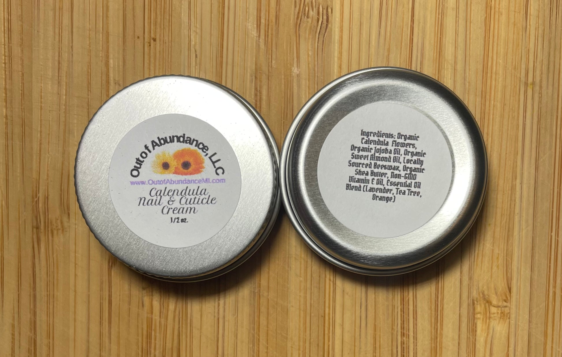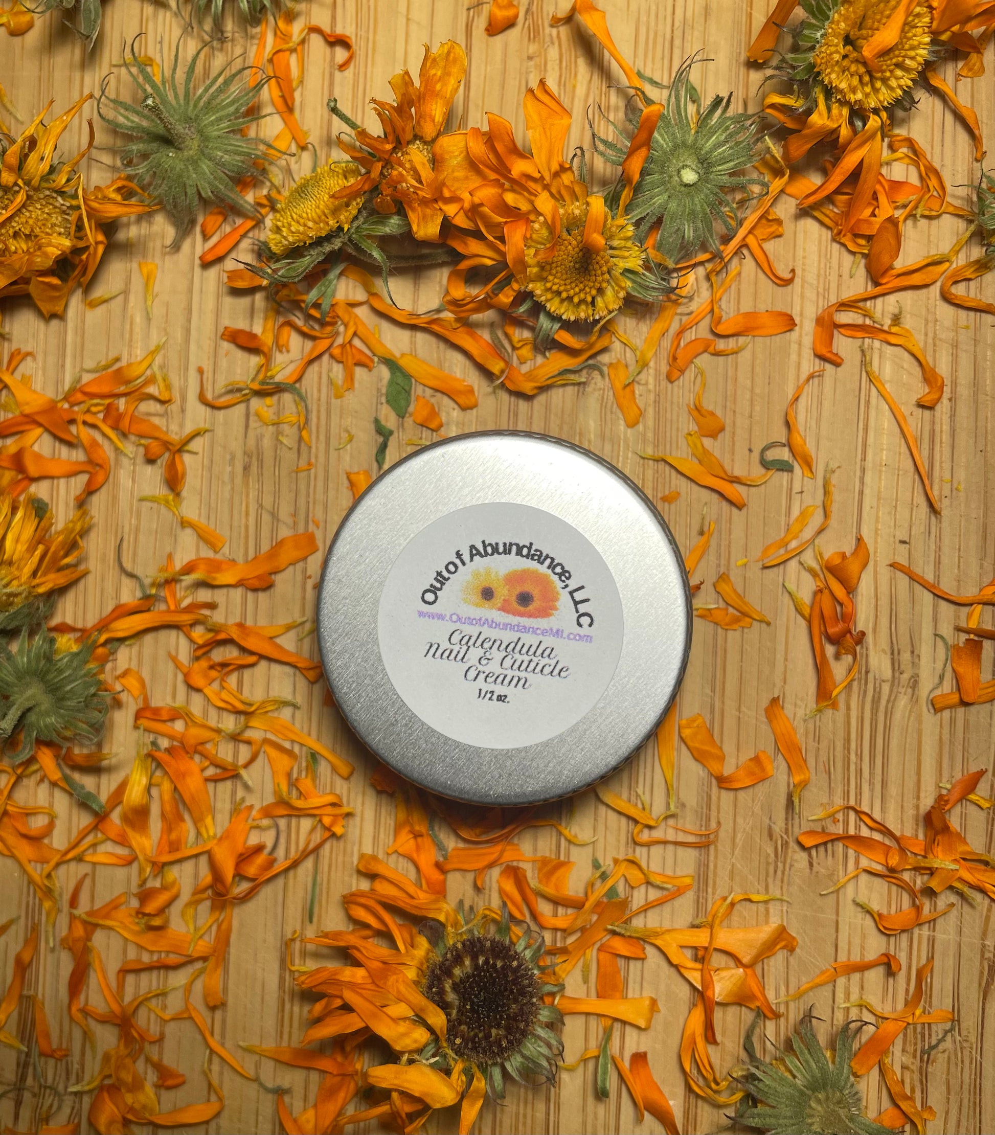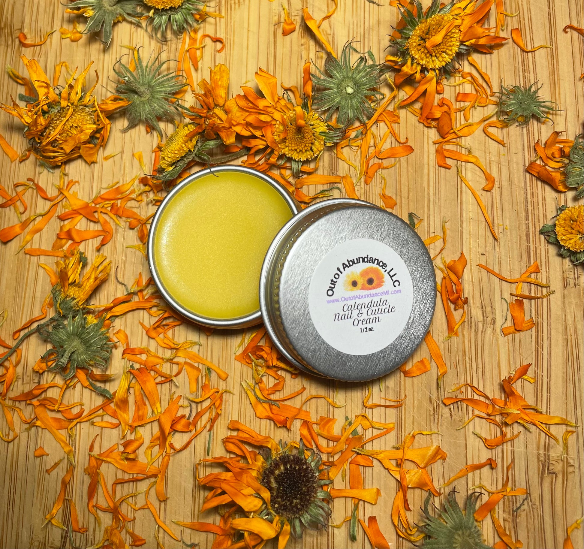 Out of Abundance Calendula Nail & Cuticle Cream is designed to help you grow strong and healthy nails. Nail growth is affected by the health and hydration of your cuticles. When your cuticles are dry and damaged your nail beds are not properly protected and your nails are prone to splitting, cracking and being brittle. Commercial cuticle creams often contain harsh chemicals to dissolve your cuticles instead of nourishing them. Out of Abundance Calendula Nail & Cuticle Cream is full of herbal infused organic oils that will quickly absorb, hydrate and nourish your nails and cuticles.
