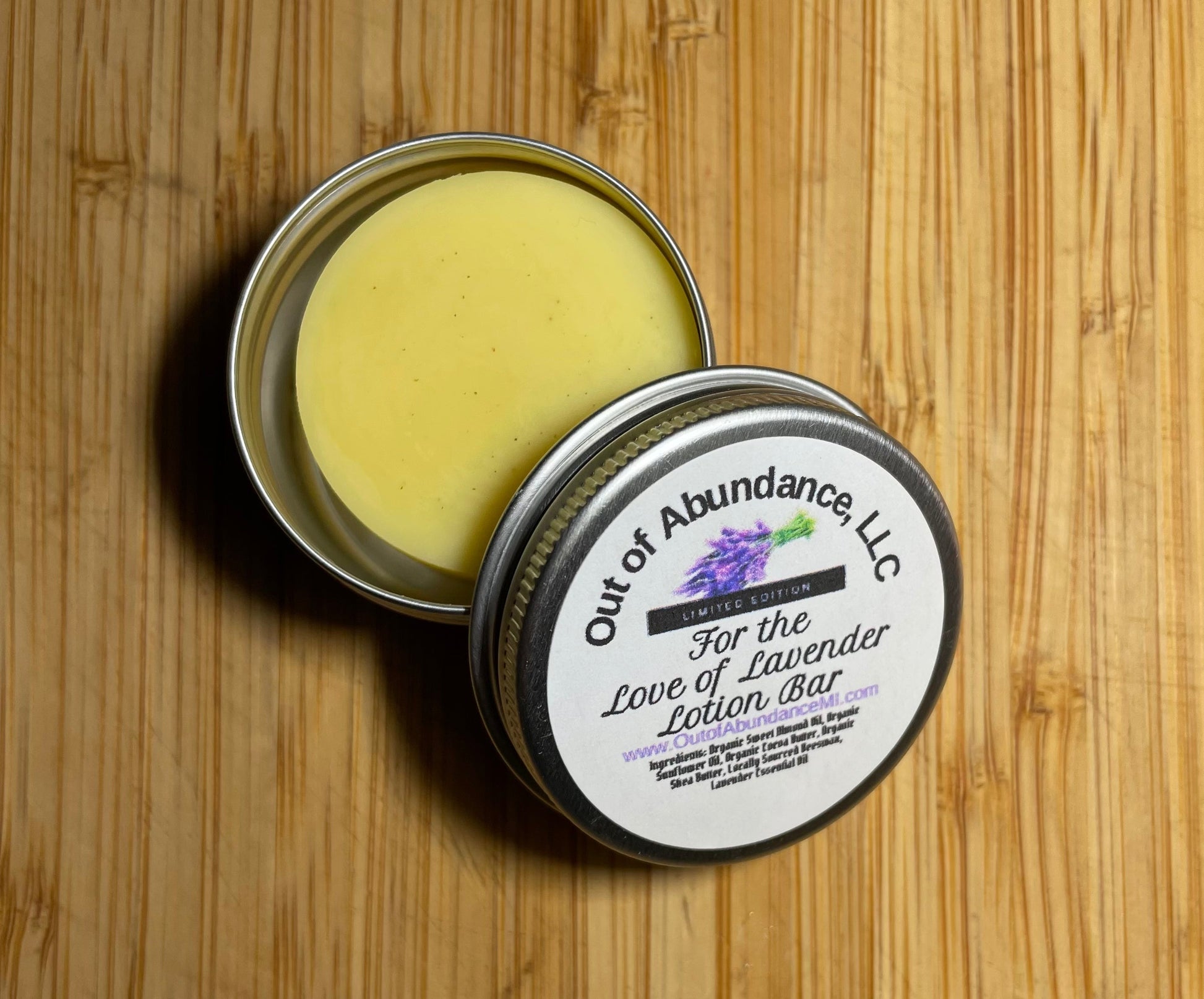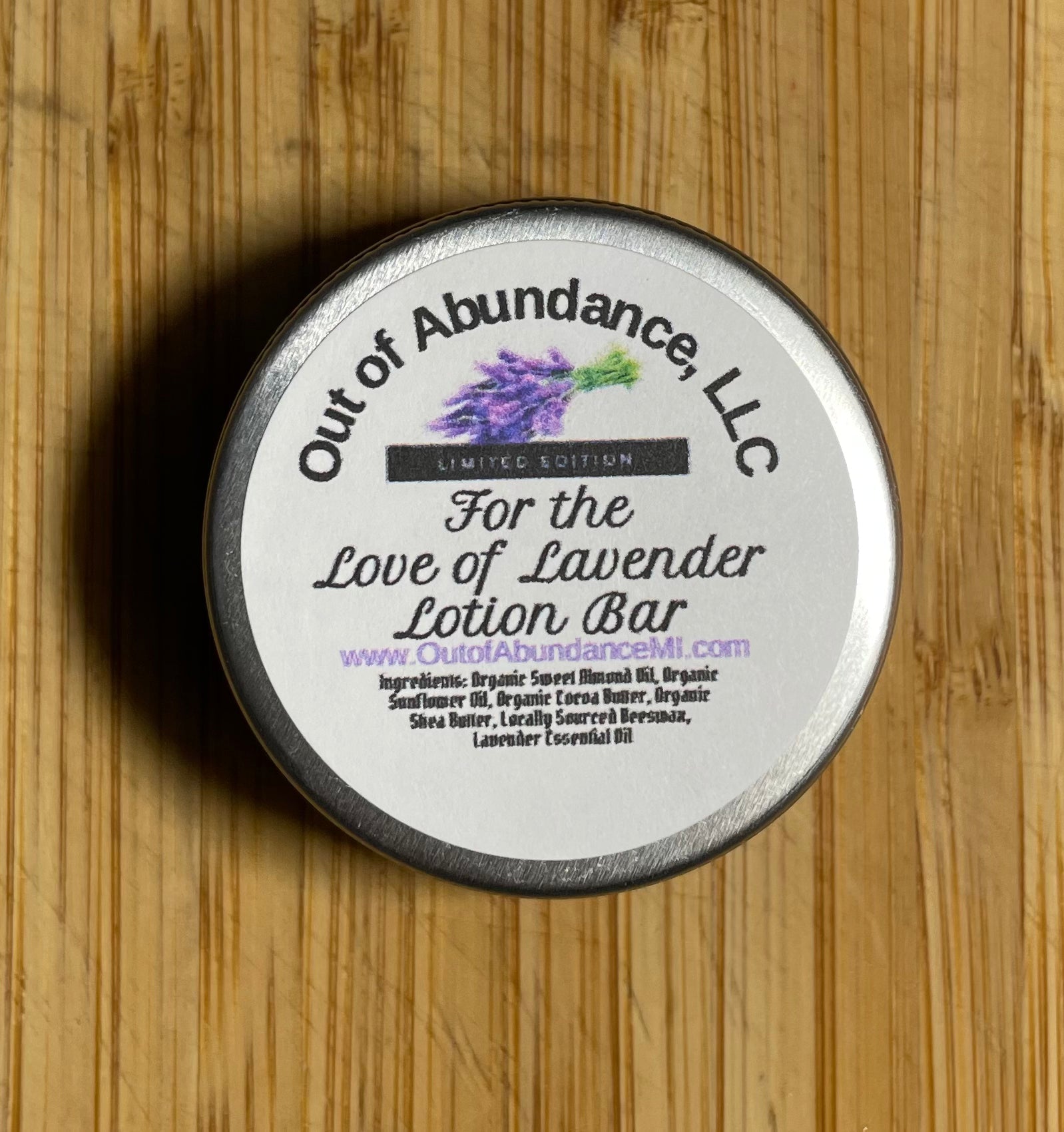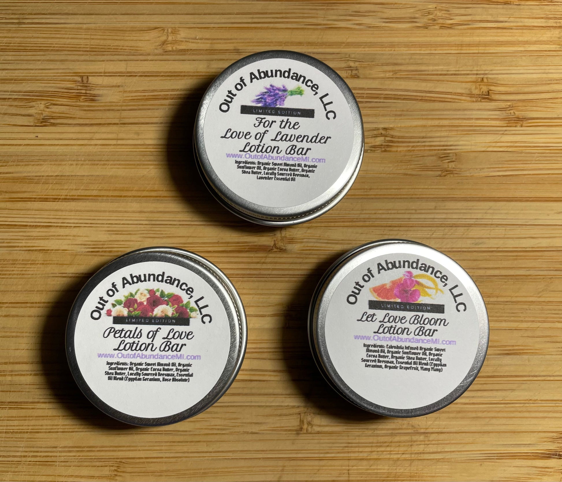 Out of Abundance Mini/Full size Lotion Bars are a super moisturizing waterless lotion concentrate. Our solid bars are packed full of quick absorbing oils/butters to moisturize and beeswax to seal the moisture in. The sealing effect of the beeswax prevents trans-dermal water loss for a long lasting effect. Mini Lotion bars are a natural choice made with organic oils and butters including; sweet almond oil, sunflower oil, cocoa butter and shea butter. The essential oil fragrances in Out of Abundance Lotion Bars are free of phthalates and parabens making them a clean beauty product. Choosing a waterless lotion bar saves resources the first being water. ONE (full size) Solid Lotion Bar can stop up to 3 plastic lotion bottles from reaching our landfills. Also, because lotion bars are anhydrous they are free of preservatives. Water is the main breeding source for things like mold, when we leave the water out we can also leave the preservatives out. They are compact and very portable and easy to throw into a purse, suitcase or tote for moisture on the go with no fear of mess.