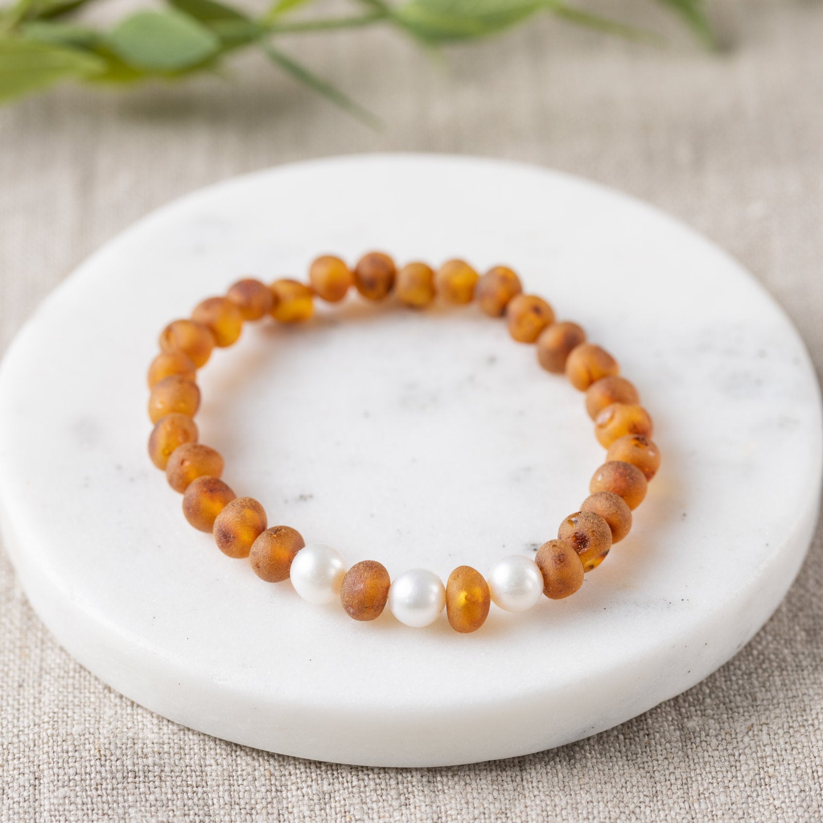 Freshwater Pearl Accent + Raw Cognac Amber Bracelet - Adult
