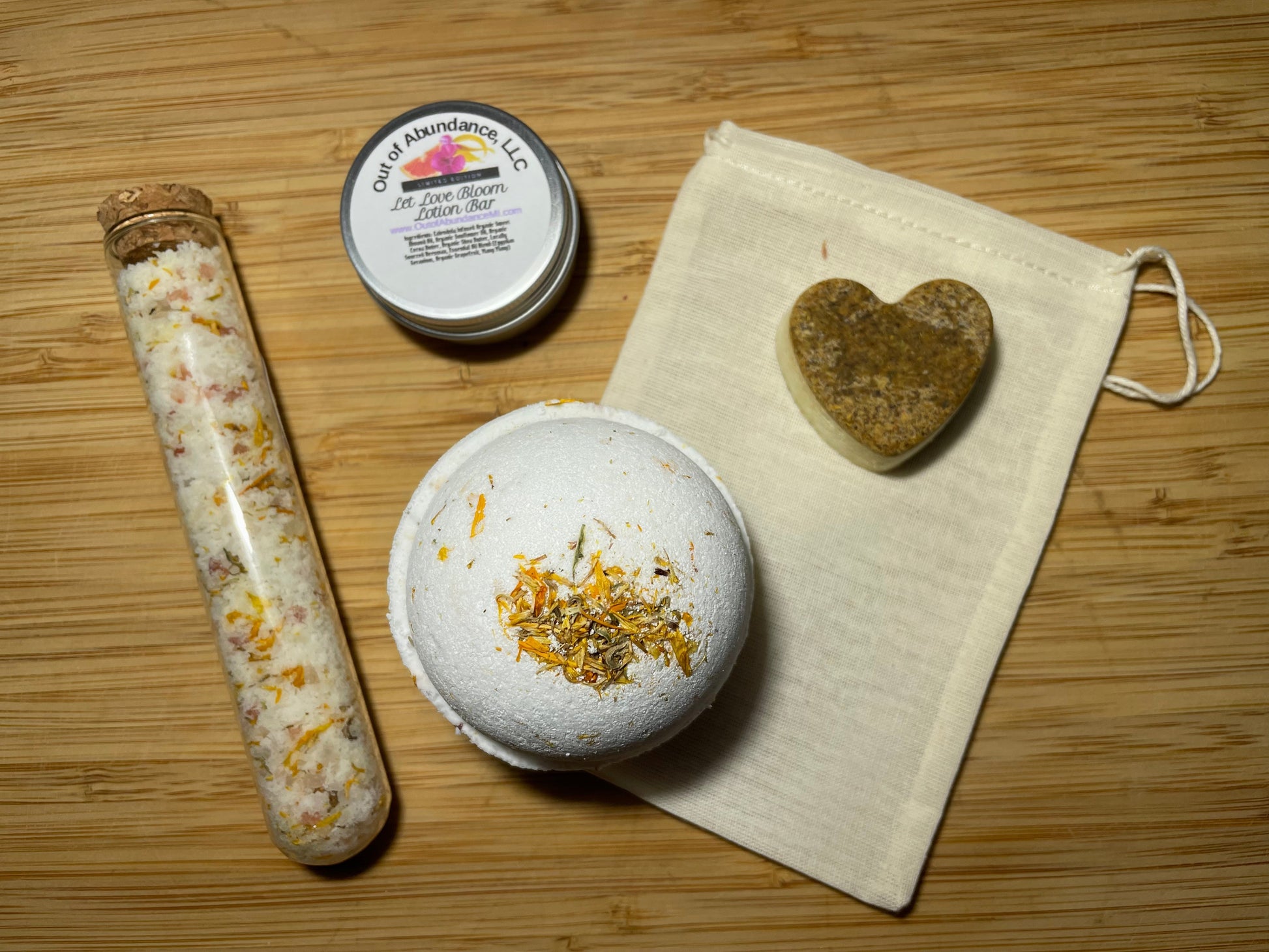 Out of Abundance, LLC Bath Salts are designed to help you relax, relieve stress, ease achy muscles and treat irritated skin. You can’t help but relax as you sink into a nice warm bath but there are so many other benefits of salt based baths. Your skin is your biggest organ and salt based bath provide wonderful trace minerals that your skin will thank you for. Dermatologist recommend sea salt baths for people with eczema, psoriasis, and other dry skin conditions. Studies have shown rheumatic diseases such as rheumatoid arthritis, psoriatic arthritis, ankylosing spondylitis, and knee osteoarthritis benefit from sea salt baths. Sea salt baths are known to improve circulation, relieve stiffness in joints, ease muscle cramps and sooth achy and overworked legs and feet. Take some time to enjoy the aromatic effects while you treat yourself to the self-care you deserve and wonderful health benefits of Out of Abundance, LLC Bath Salts. To use fill your bath with your favorite temperature water then pour the entire shot in and enjoy. You can also pour the shot into the provided muslin bag to contain the herbs then tie to faucet or place in tub when filling.