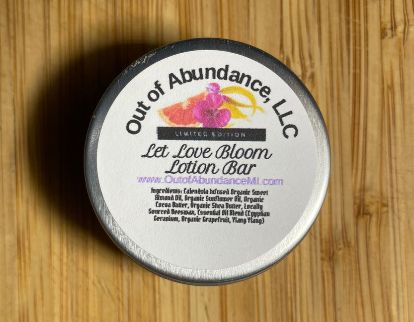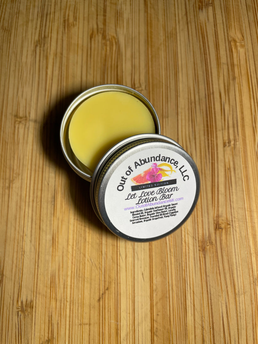 Out of Abundance Mini/Full size Lotion Bars are a super moisturizing waterless lotion concentrate. Our solid bars are packed full of quick absorbing oils/butters to moisturize and beeswax to seal the moisture in. The sealing effect of the beeswax prevents trans-dermal water loss for a long lasting effect. Mini Lotion bars are a natural choice made with organic oils and butters including; sweet almond oil, sunflower oil, cocoa butter and shea butter. The essential oil fragrances in Out of Abundance Lotion Bars are free of phthalates and parabens making them a clean beauty product. Choosing a waterless lotion bar saves resources the first being water. ONE (full size) Solid Lotion Bar can stop up to 3 plastic lotion bottles from reaching our landfills. Also, because lotion bars are anhydrous they are free of preservatives. Water is the main breeding source for things like mold, when we leave the water out we can also leave the preservatives out. They are compact and very portable and easy to throw into a purse, suitcase or tote for moisture on the go with no fear of mess.