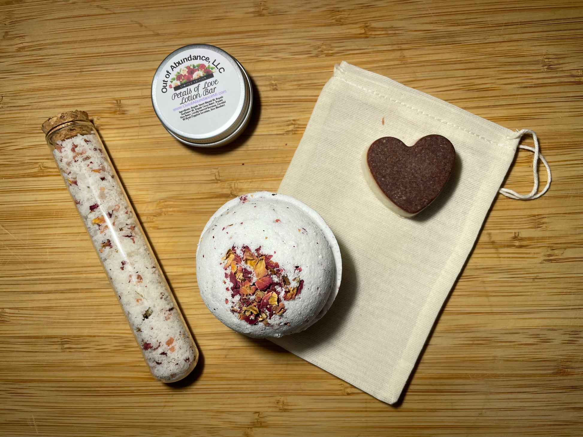 Out of Abundance, LLC bath melts are made with organic nourishing butter with organic flowers to leave your skin feeling well hydrated and so soft after your relaxing soak in the tub. To use simple drop one melt into the bath and enjoy the herbal and moisturizing properties as well as the aroma therapy. These bath melts can be cut in half to get more baths out of them or cut smaller to put in a small soaking tub to target problem areas like hands and feet when they need some extra attention. The added benefits of our selected herbs give our bath melts and extra boost. Please use care getting out of the tub as your skin will be left with the moisturizing effects of the butter.