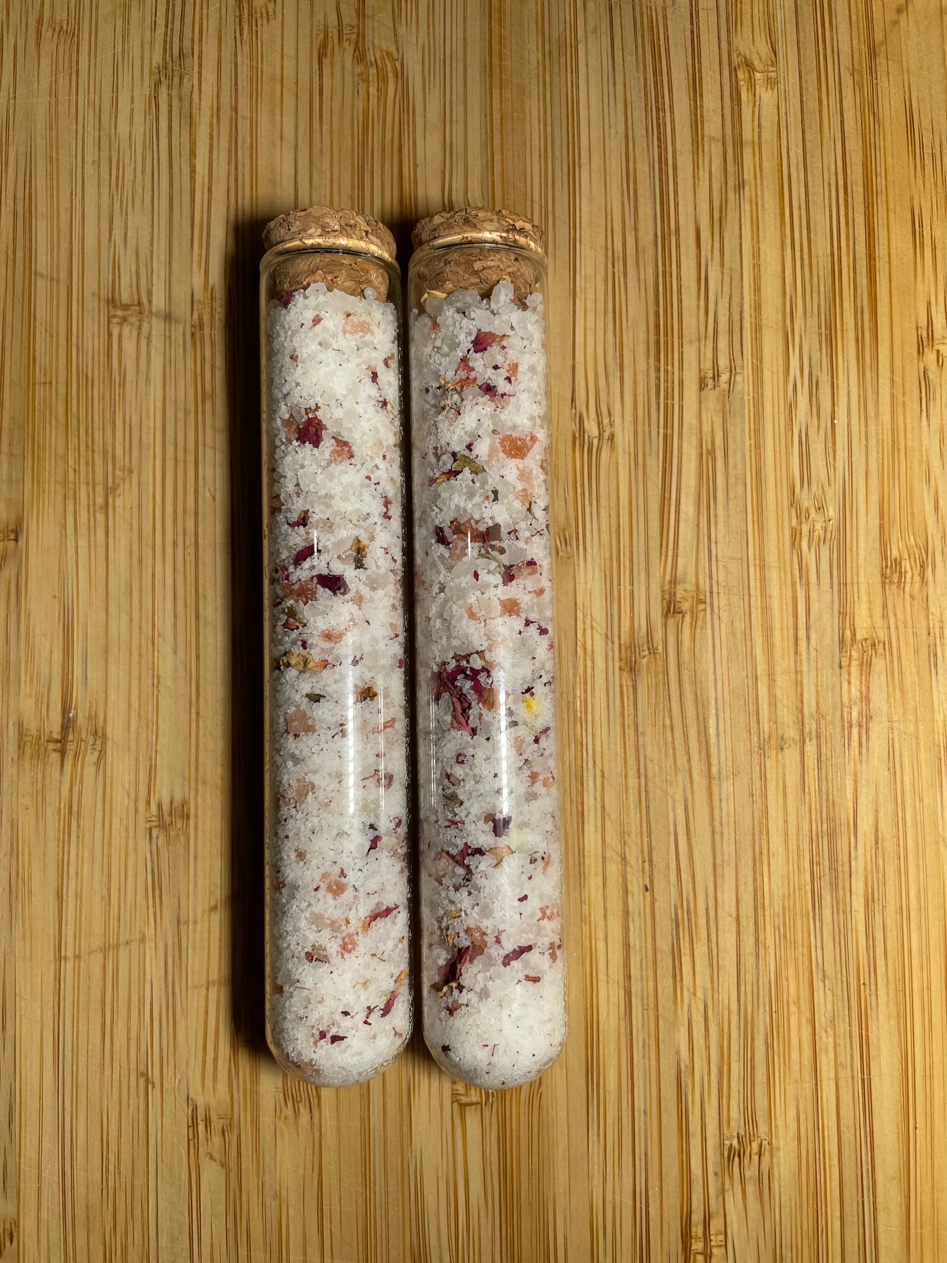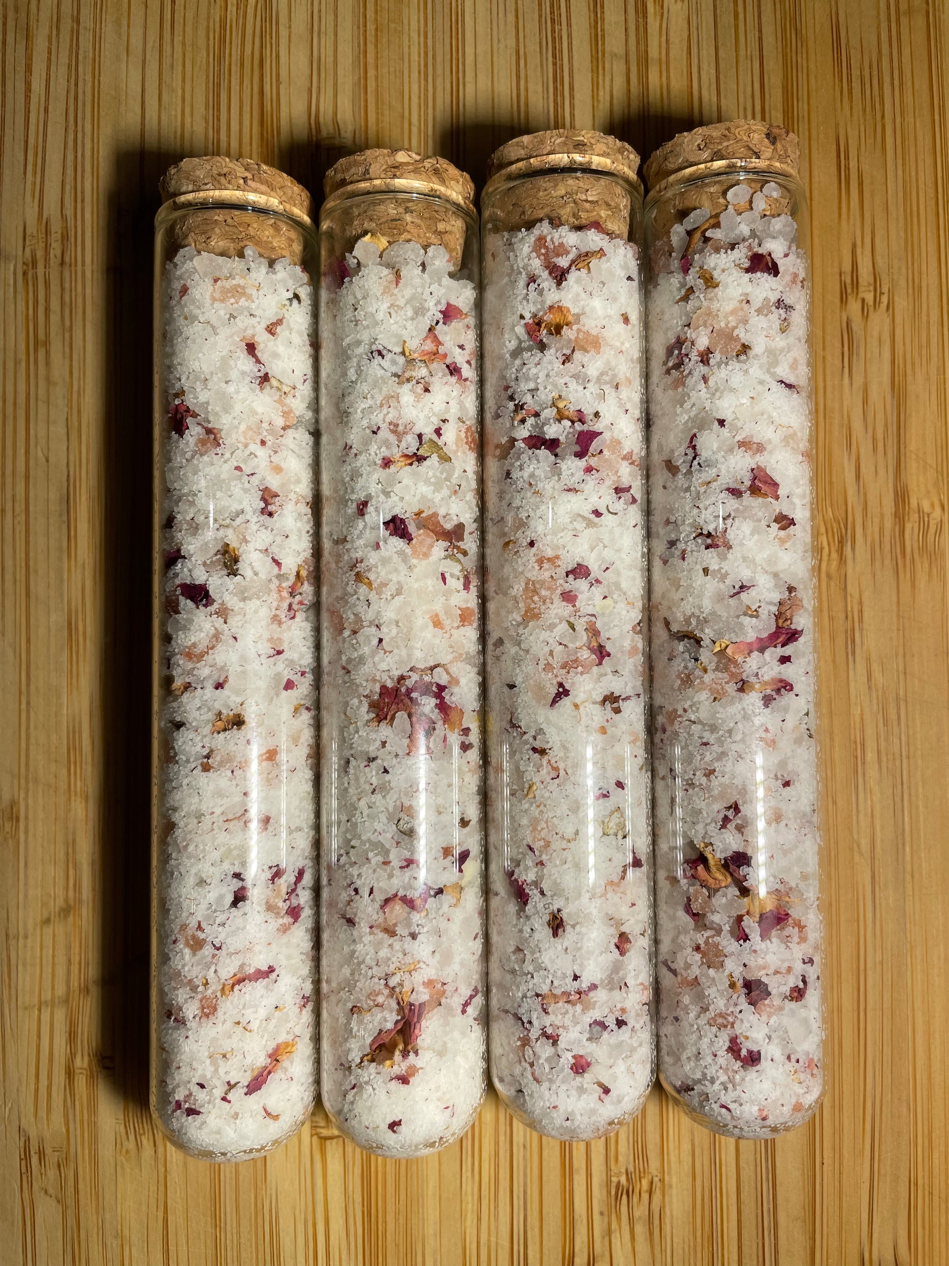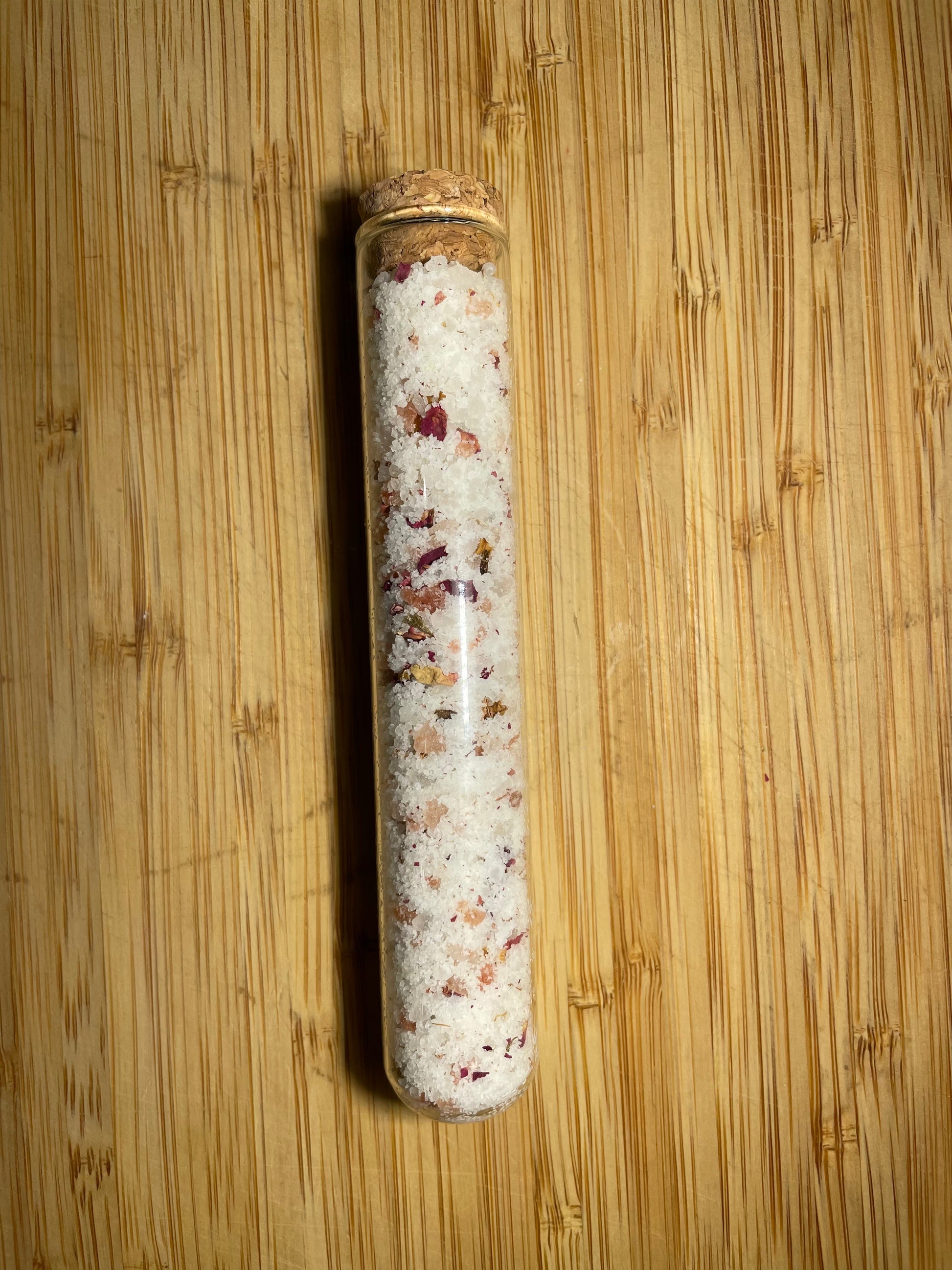 Ingredients: Dead Sea Salt, Pink Himalayan Salt, Epsom Salt, Baking Soda, Organic Oil (Could include: Sweet Almond, Sunflower, Olive, Jojoba, Apricot, Argon), Organic Herbal Flowers (Could include: Calendula, Rose, Lavender, Chamomile, Lavender), Single Essential Oil or Essential Oil Blend