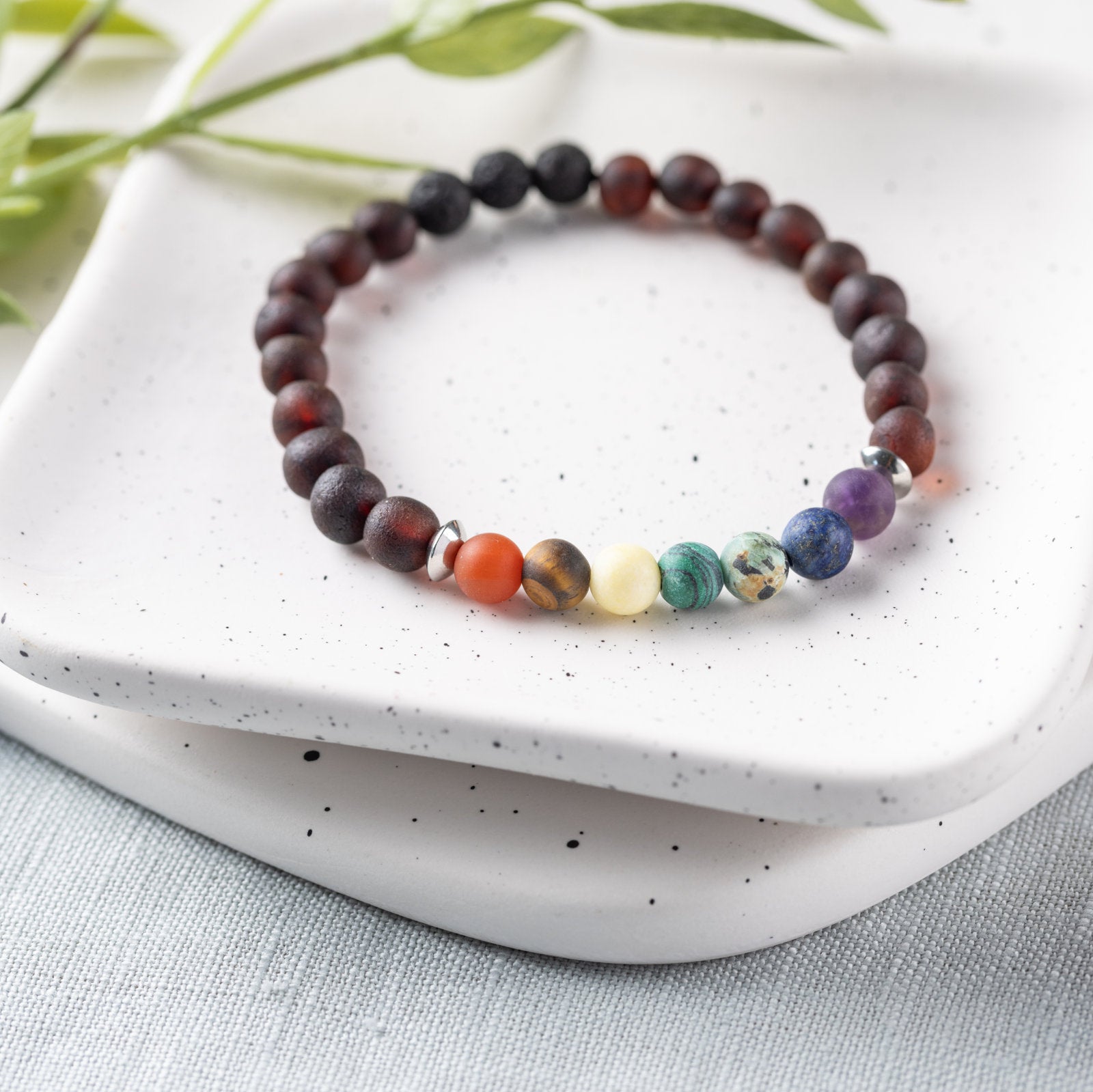 For R.B. Amber & Sons Chakra designs, are made of genuine Red Carnelian, Tiger Eye, Yellow Jade, Malachite, African Turquoise Jasper, Lapis Lazuli, and Amethyst, known to reduce anxiety, and assist with inflammation, pain relief, sleep, eczema, digestion, and ADHD.