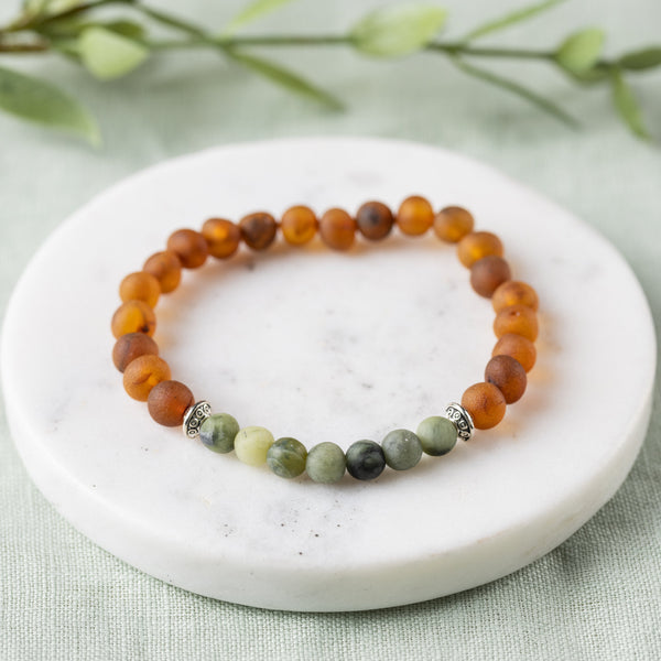Raw Green Jade + Raw Cognac Amber Bracelet - Adult