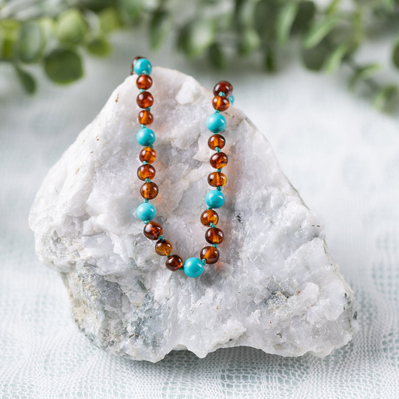 Turquoise Gemstones + Cognac Amber Necklace - Child