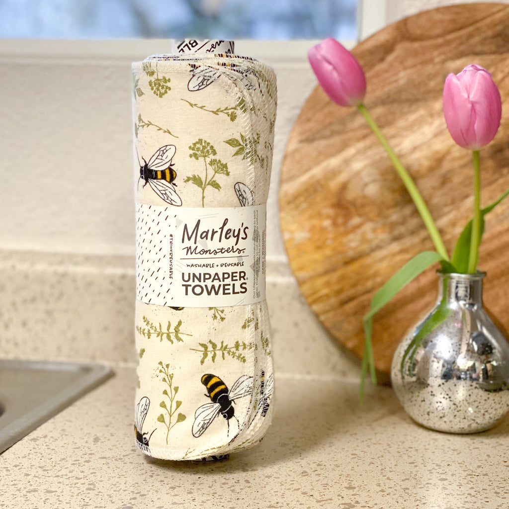 Each set of Marley's Monsters UNpaperⓇ Towels typically contains 12 towels, which are available in a range of colors and patterns to suit your personal style. UNpaper® Towels are convenient and good for the environment. Simply wipe, wash, roll, and reuse!