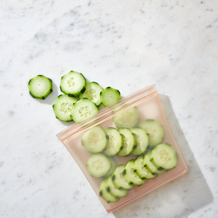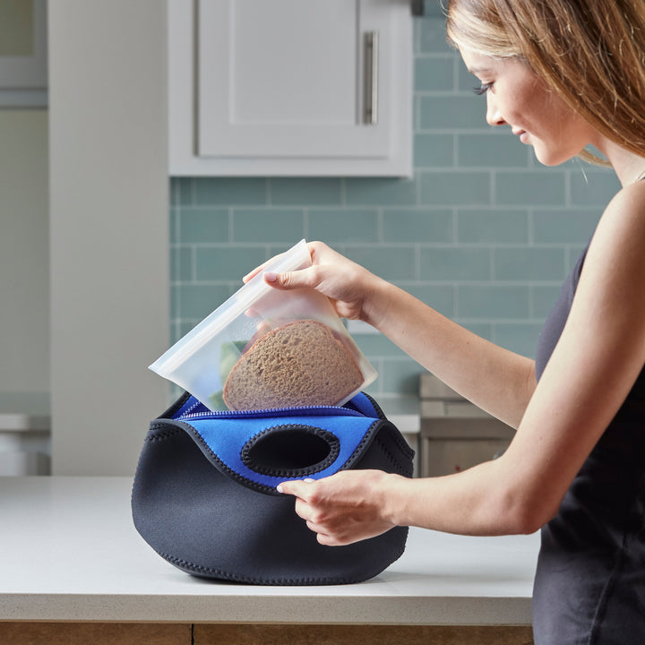 The first sandwich bag that stands up, stays open and zips shut. Perfect for snacks and lunches at work, school or wherever. Our bag actually gets clean in the dishwasher with its open rounded interior. Available in 2 sizes or in a convenient nesting set.